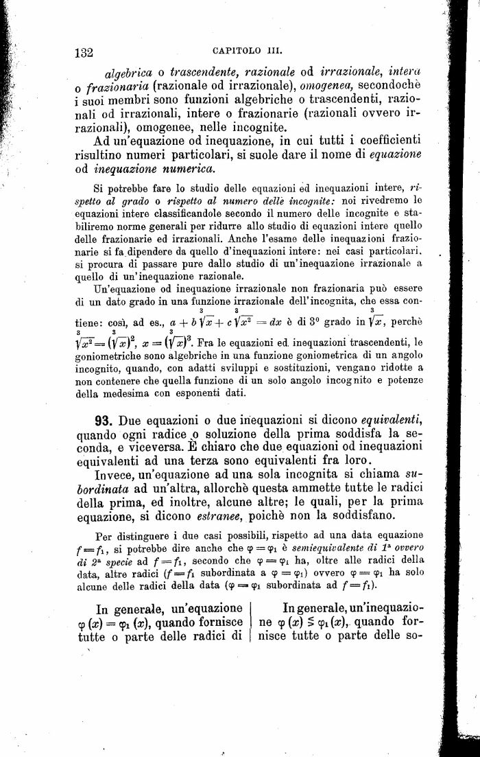 93. Due equazioni o due inequazioni si dicono equivalenti, quando ogni radice fi soluzione della prima soddisfa la seconda, e viceversa. E chiaro che due equazioni od inequazioni equivalenti ad una terza sono equivalenti fra loro.