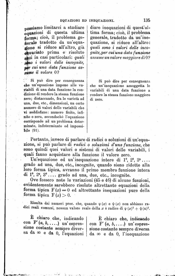 '. ' Si può dire per conseguenza che un'equazione impone alle variabili di una data funzione la condizione di rendere la stessa funzione zero; distaccando, fra le varietà ad una, due, etc., dimensioni, un certo numero di valori delle variabili che vi soddisfano: numero finito, infinito o zero, secondochè l'equazione corrisponde ad un problema determinato, indeterminato od impossibile (91).