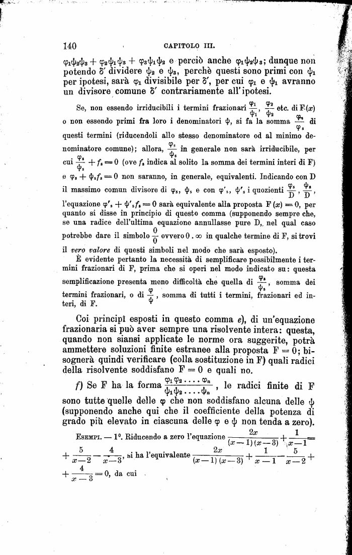 Coi principi esposti in questo comma e), di un'equazione frazionaria si può aver sempre una risolvente intera: questa, quando non siansi applicate le norme ora suggerite, potrà ammettere soluzioni finite estranee alla proposta F = 0 ; bisognerà quindi verificare (colla sostituzione in F) quali radici della risolvente soddisfano F = 0 e quali no.