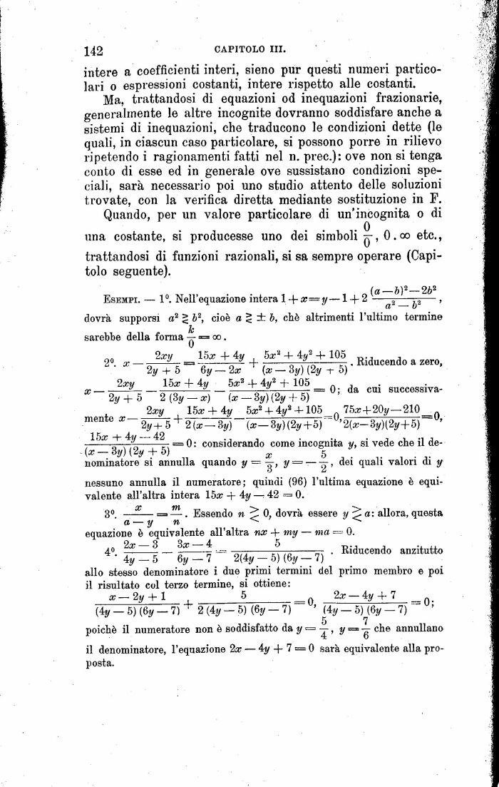 Ma, trattandosi di equazioni od inequazioni frazionarie, generalmente le altre incognite dovranno soddisfare anche a sistemi di inequazioni, che traducono le condizioni dette (le quali, in ciascun caso particolare, si possono porre in rilievo ripetendo i ragionamenti fatti nel n. prec.): ove non si tenga conto di esse ed in generale ove sussistano condizioni speciali, sarà necessario poi uno studio attento delle soluzioni trovate, con la verifica diretta mediante sostituzione in F. Quando, per un valore particolare di un'incognita o di