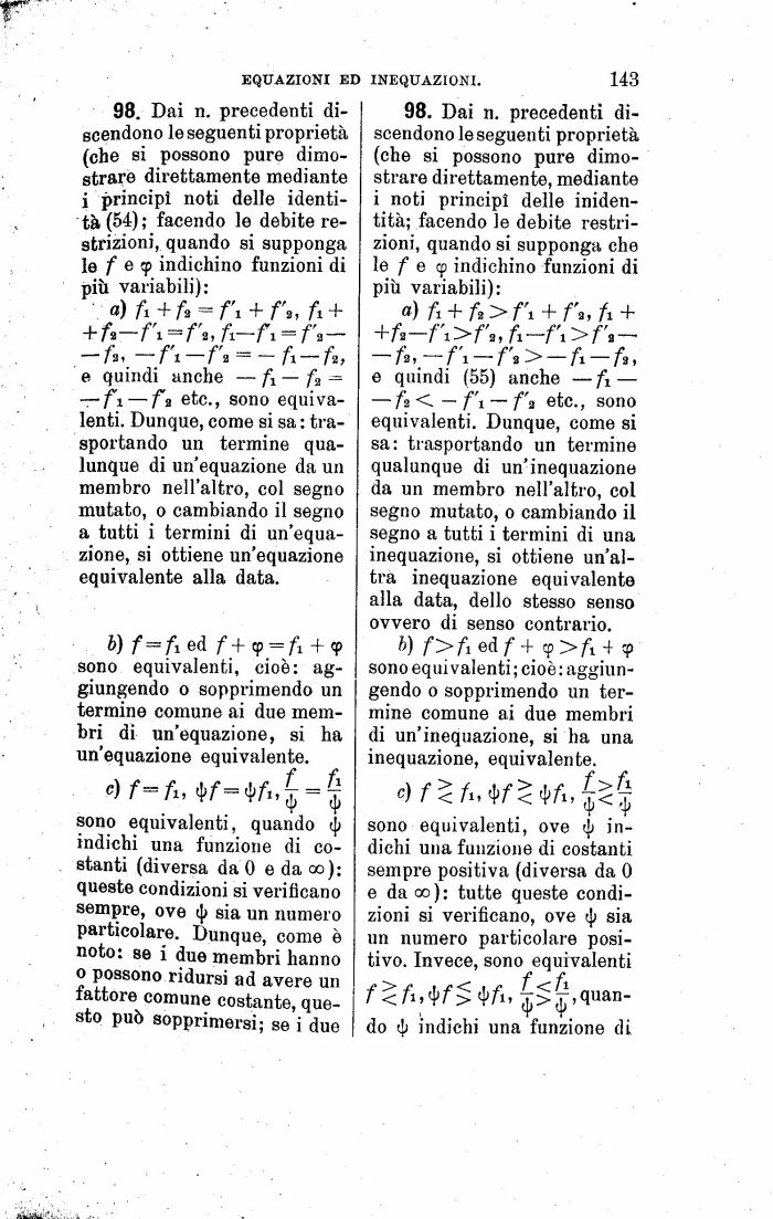 fa < fi fa etc., sono equivalenti. Dunque, come si sa: trasportando un termine qualunque di un'inequazione da un membro nell'altro, col segno mutato, o cambiando il segno a tutti i termini di una inequazione, si ottiene un'altra inequazione equivalente alla data, dello stesso senso ovvero di senso contrario.