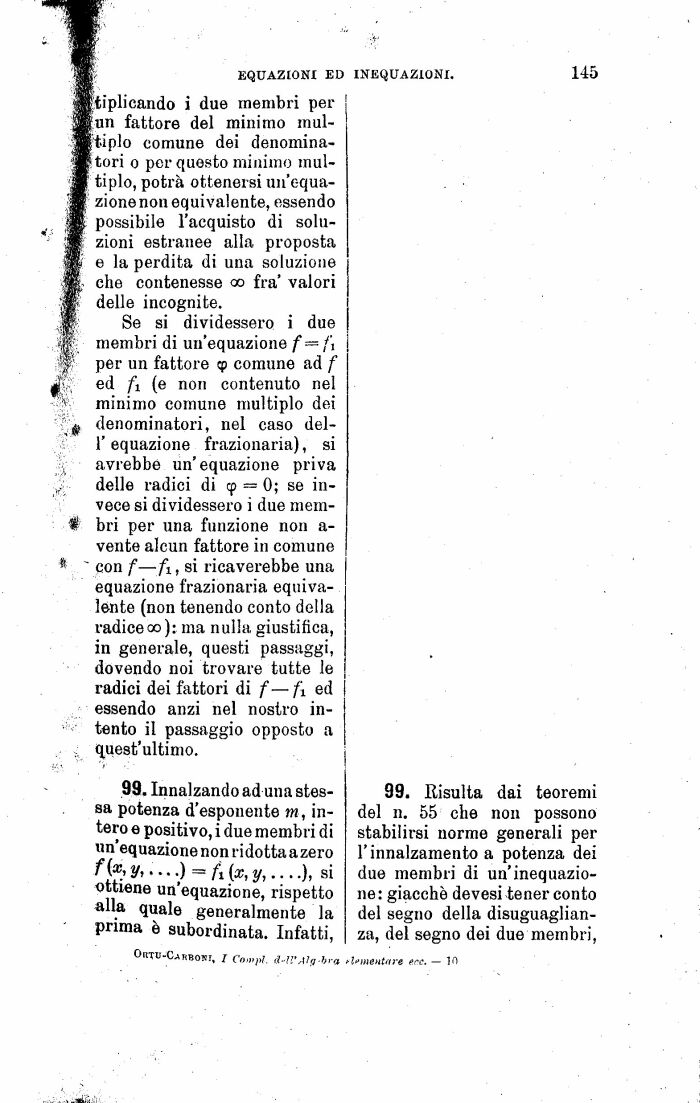 99. Risulta dai teoremi del n. 55 che non possono stabilirsi norme generali per l'innalzamento a potenza dei due membri di un'inequazione: giacche devesi tener conto del segno della disuguaglianza, del segno dei due membri,