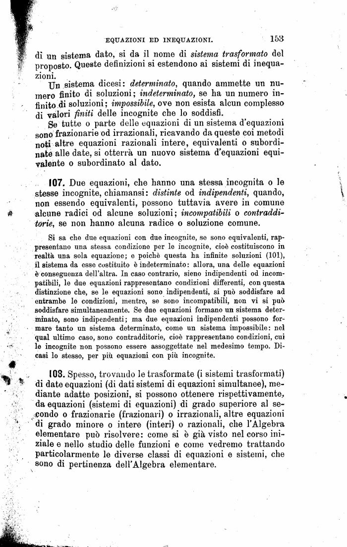 107. Due equazioni, che hanno una stessa incognita o le stesse incognite, chiamansi: distinte od indipendenti, quando, non essendo equivalenti, possono tuttavia avere in comune alcune radici od alcune soluzioni; incompatibili o contradditorie, se non hanno alcuna radice o soluzione comune.