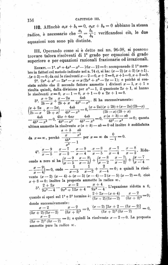 III. Operando come si è detto nei nn. 96-98, si possono trovare talora risolventi di 1° grado per equazioni di grado superiore e per equazioni razionali frazionarie od irrazionali.