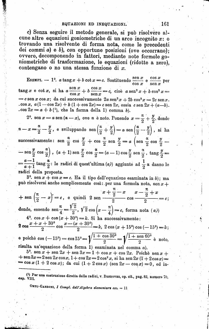c) Senza seguire il metodo generale, si può risolvere alcune altre equazioni goniometriche di un arco incognito x: o trovando una risolvente di forma nota, come le precedenti dei commi a) e ò), con opportune posizioni (ove occorrano) ; ovvero, decomponendo in fattori, mediante note formolo goniometriche di trasformazione, le equazioni (ridotte a zero), contengano o no una stessa funzione di x.