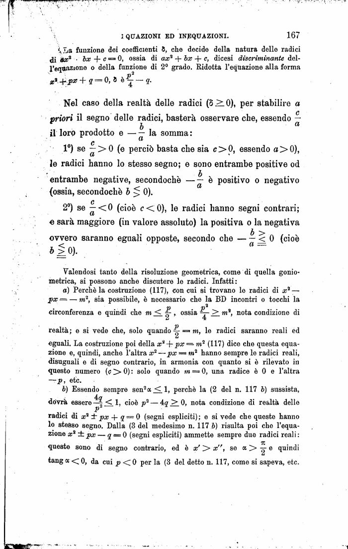 eguali. La costruzione poi della x'J -f- px = m2 (117) dice che questa equazione e, quindi, anche l'altra x2 px m2 hanno sempre le radici reali, disuguali e di segno contrario, in armonia con quanto si è rilevato in questo numero (c > 0) : solo quando m = 0, una radice è 0 e l'altra p, etc.