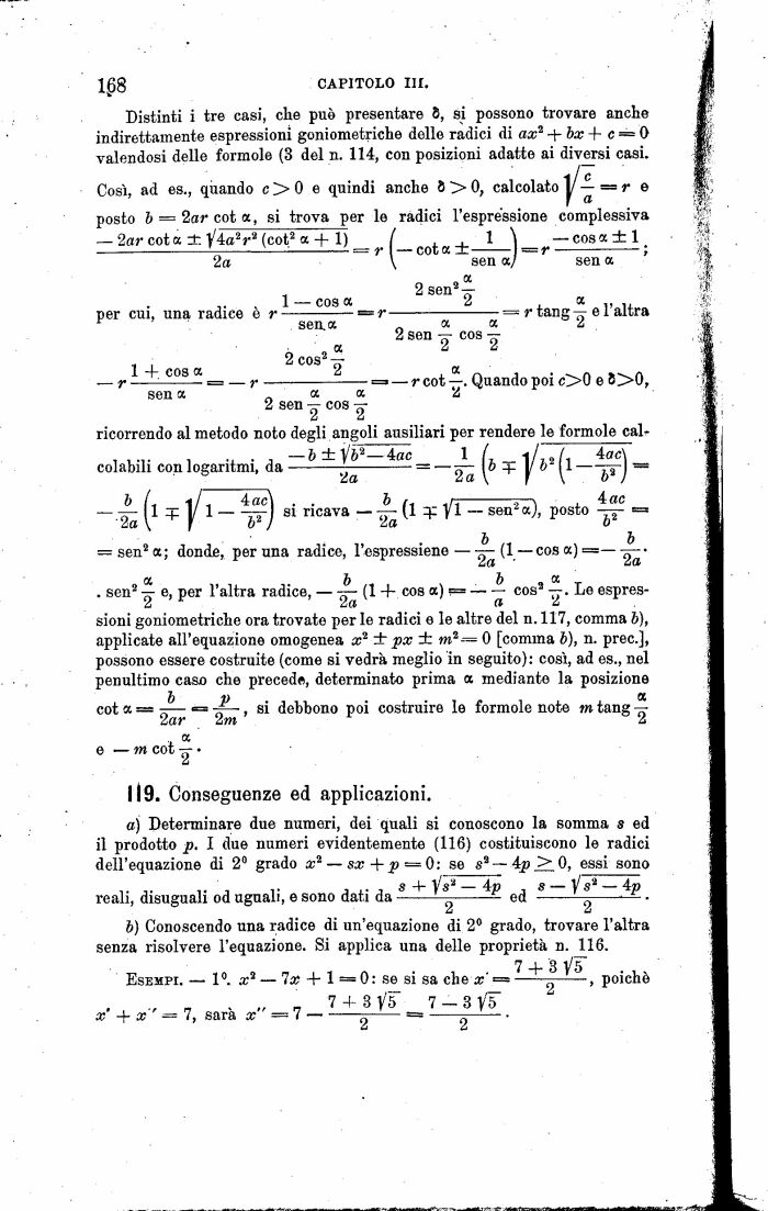Distinti i tre casi, che può presentare S, si possono trovare anche indirettamente espressioni goniometriche delle radici di ax2 4- bx 4- c = 0 valendosi delle formolo (3 del n. 114, con posizioni adatto ai diversi casi.