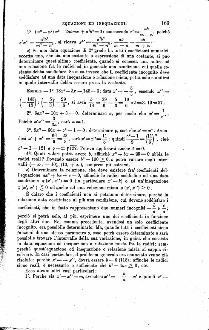 perciò si potrà solo, al più, esprimere uno dei coefficienti in funzione degli altri due. Nel comma precedente, avendosi un solo coefficiente incognito, era possibile determinarlo. Ma, quando tutti i coefficienti sieno funzioni di uno stesso parametro p, esso potrà essere determinato o sarà possibile trovare l'intervallo della sua variazione, in guisa che sussista la data equazione od inequazione o relazione mista fra le radici: sem-prechè quest'equazione od inequazione 0 relazione mista si sappia risolvere. In casi particolari, il problema generale ora enunciato venne già risoluto: perchè x'= x', dovrà essere 6 = 0 (115); affinchè le radici sieno reali, è necessario e sufficiente che b2 4oc _> 0, etc. Ecco alcuni altri casi particolari : ^