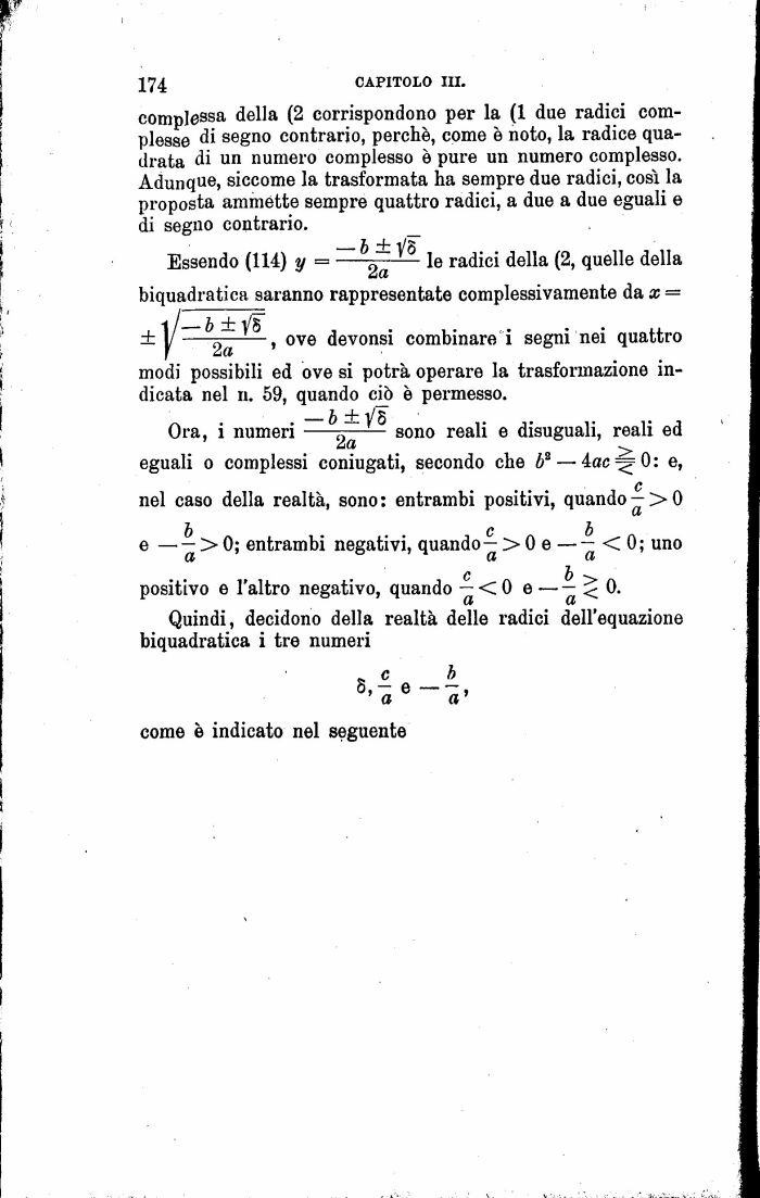 complessa della (2 corrispondono per la (1 due radici complesse di segno contrario, perchè, come è noto, la radice quadrata di un numero complesso è pure un numero complesso. Adunque, siccome la trasformata ha sempre due radici, così la proposta ammette sempre quattro radici, a due a due eguali e di segno contrario.