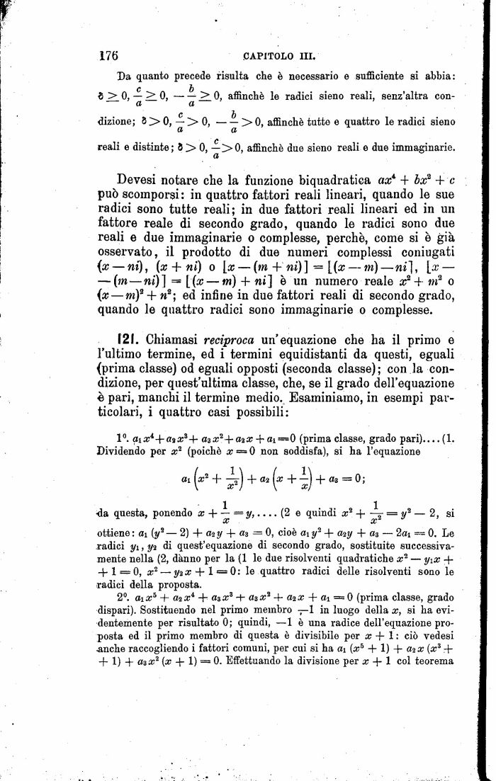 121. Chiamasi reciproca un'equazione che ha il primo e l'ultimo termine, ed i termini equidistanti da questi, eguali {prima classe) od eguali opposti (seconda classe); con la condizione, per quest'ultima classe, che, se il grado dell'equazione è pari, manchi il termine medio. Esaminiamo, in esempi particolari, i quattro casi possibili: