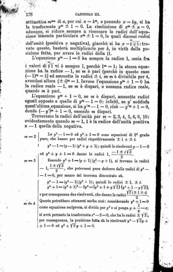 aritmetica mma di a, per cui a = km, e ponendo x = ky, si ha la trasformata ym ± 1 = 0. La risoluzione di xm ± a 0, adunque, si riduce sempre a ricercare le radici dell'equazione binomia particolare xm ± 1 = 0, le quali diconsi radici