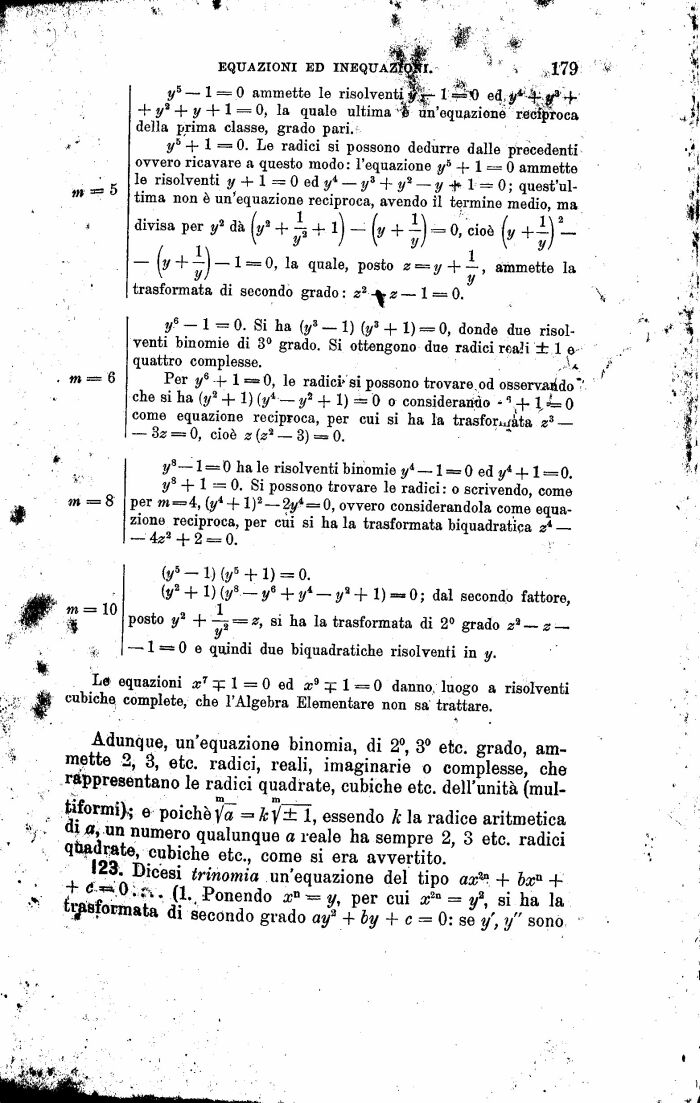 Adunque, un'equazione binomia, di 2°, 3° etc. grado, ammette 2, 3, etc. radici, reali, imaginarie o complesse, che rappresentano le radici quadrate, cubiche etc. dell'unità (mul-