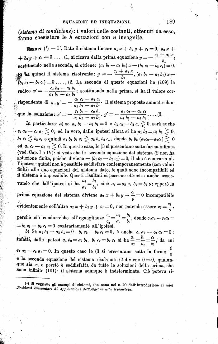 %e la seconda equazione del sistema risolvente (2 diviene 0=0, qualunque sia x, e perciò è soddisfatta da tutte le soluzioni della prima, che sono infinite (101) : il sistema adunque è indeterminato. Ciò poteva ri-