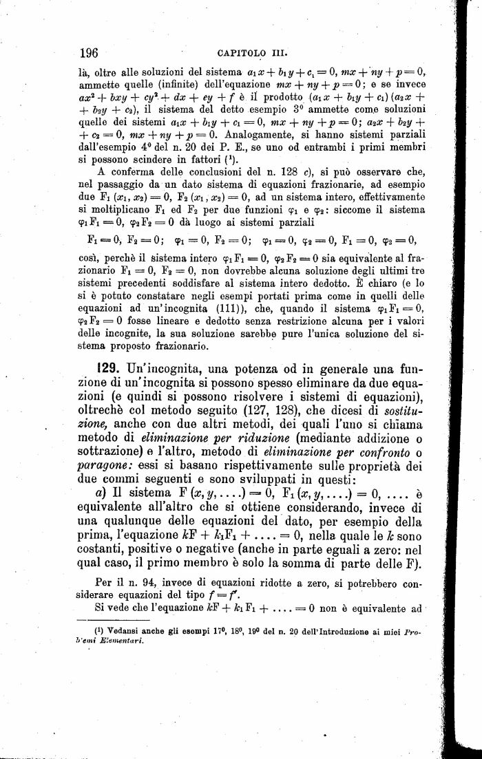 129. Un'incognita, una potenza od in generale una funzione di un'incognita si possono spesso eliminare da due equazioni (e quindi si possono risolvere i sistemi di equazioni), oltreché col metodo seguito (127, 128), che dicesi di sostituzione, anche con due altri metodi, dei quali l'uno si chiama metodo di eliminazione per riduzione (mediante addizione 0 sottrazione) e l'altro, metodo di eliminazione per confronto 0 paragone: essi si basano rispettivamente sulle proprietà dei due commi seguenti e sono sviluppati in questi: