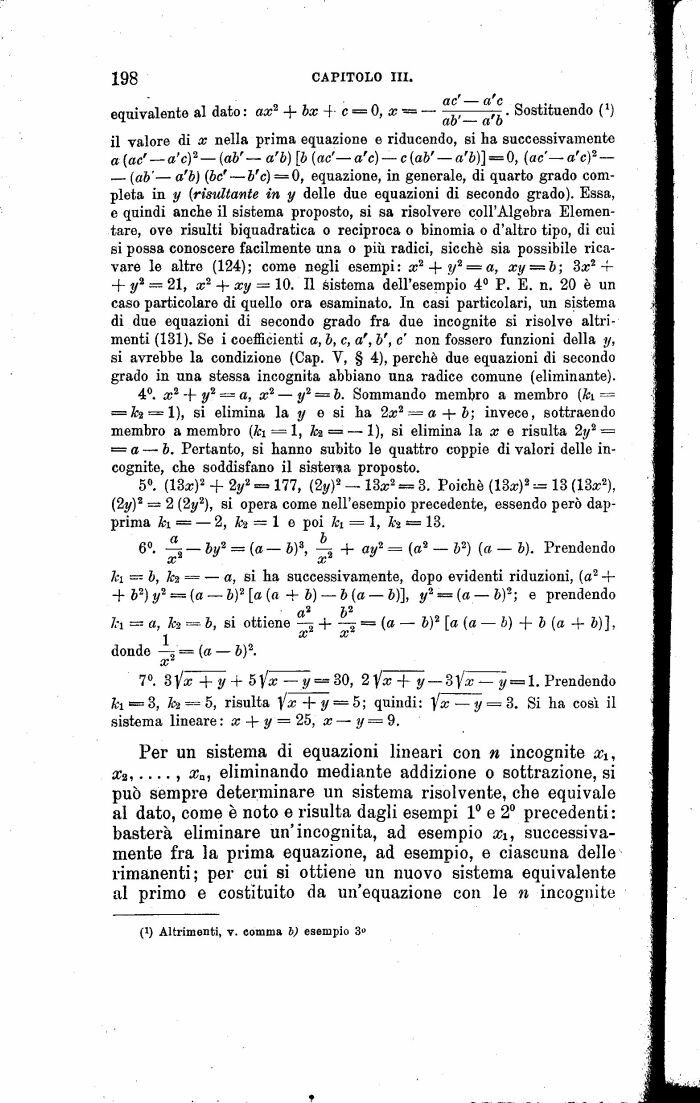 il valore di x nella prima equazione e riducendo, si ha successivamente a (ac' a'e)2 (ab' a'b) [b (ac' a'c) c {ab' a'b)] = 0, (oc o'c)2 (ab' a'b) {be' b'c) = 0, equazione, in generale, di quarto grado completa in y (risultante in y delle due equazioni di secondo grado). Essa, e quindi anche il sistema proposto, si sa risolvere coll'Algebra Elementare, ove risulti biquadratica o reciproca o binomia o d'altro tipo, di cui si possa conoscere facilmente una o più radici, sicché sia possibile ricavare le altre (124); come negli esempi: x2 + y2=*a, xy b; Sx2 + + y2 = 21, x2 + xy = 10. Il sistema dell'esempio 4° P. E. n. 20 è un caso particolare di quello ora esaminato. In casi particolari, un sistema di due equazioni di secondo grado fra due incognite si risolve altrimenti (131). Se i coefficienti a, b, e, a', V, e non fossero funzioni della y, si avrebbe la condizione (Cap. V, § 4), perchè due equazioni di secondo grado in una stessa incognita abbiano una radice comune (eliminante).