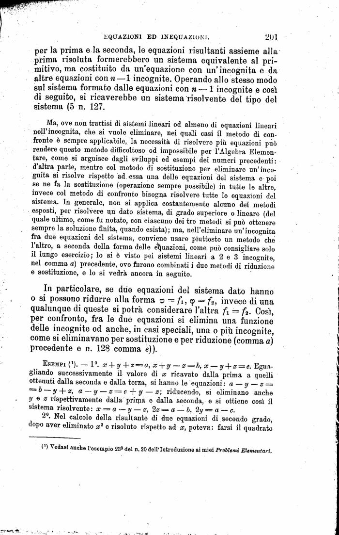Ma, ove non trattisi di sistemi lineari od almeno di equazioni lineari nell'incognita, che si vuole eliminare, nei quali casi il metodo di confronto è sempre applicabile, la necessità di risolvere più equazioni può rendere questo metodo difficoltoso od impossibile per l'Algebra Elementare, come si arguisco dagli sviluppi ed esempi dei numeri precedenti: d'altra parte, mentre col metodo di sostituzione per eliminare un'incognita si risolve rispetto ad essa una delle equazioni del sistema e poi se ne fa la sostituzione (operazione sempre possibile) in tutte le altre, invece col metodo di confronto bisogna risolvere tutte le equazioni del sistema. In generale, non si applica costantemente alcuno dei metodi esposti, per risolvere un dato sistema, di grado superiore o lineare (del quale ultimo, come fu notato, con ciascuno dei tre metodi si può ottonere sempre la soluzione finita, quando esista); ma, nell'eliminare un'incognita fra due equazioni del sistema, conviene usare piuttosto un metodo che l'altro, a seconda della forma delle equazioni, come può consigliare solo il lungo esercizio; lo si è visto pei sistemi lineari a 2 e 3 incognite, nel comma a) precedente, ove furono combinati i due metodi di riduzione e sostituzione, e lo si vedrà ancora in seguito.