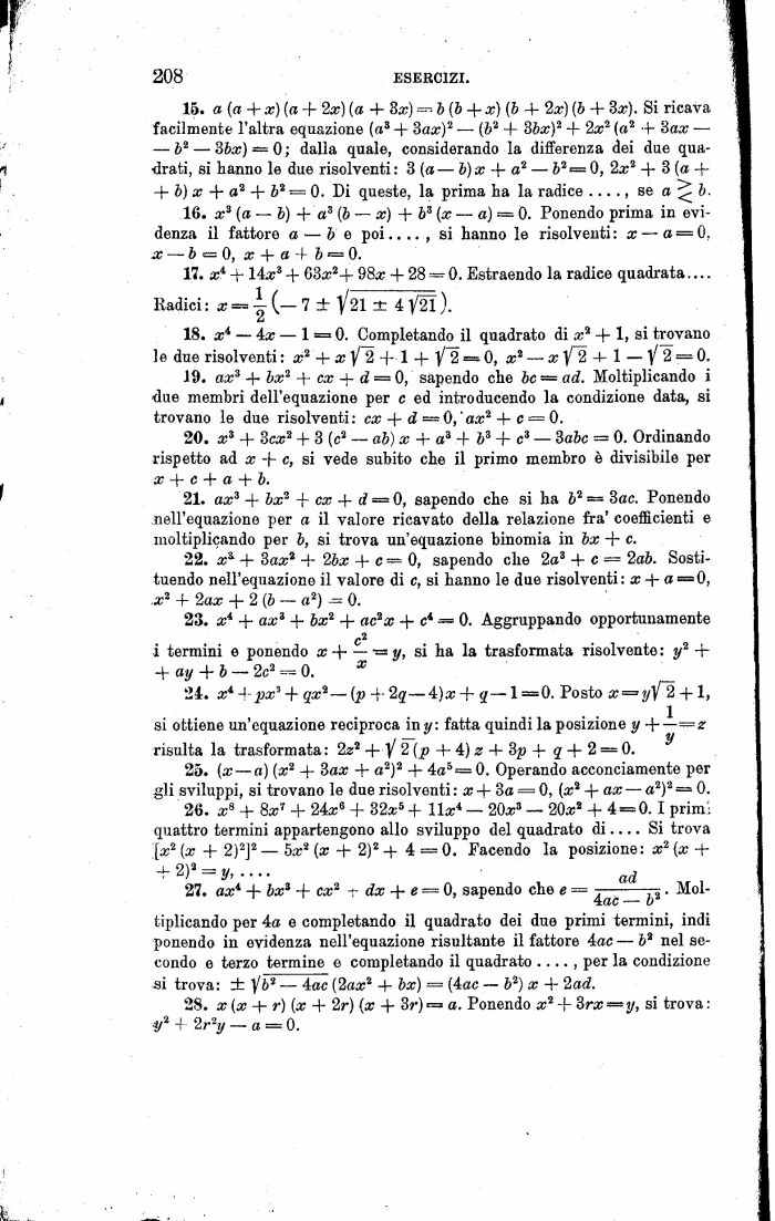 18. «4 4« 1 = 0. Completando il quadrato di x2 + 1, si trovano le due risolventi : «2 4- x Ì~2 4-1 + f2 = 0, «2 « V 2 4- 1 V 2 = 0.