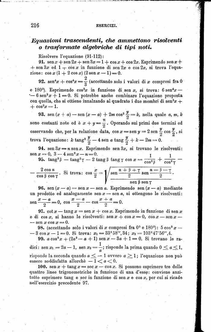 97. cota: tang x = sen x + cos x. Esprimendo in funzione di sen x e di cosa:, si hanno le risolventi: senx + cosx = 0, cosa: sena; sen x cos x = 0.
