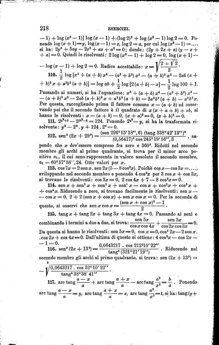 pendo che x dev'essere compreso fra zero e 360°. Ridotti nel secondo membro gli archi al primo quadrante, si trova per il minor arco positivo ai, il cui seno rappresenta in valore assoluto il secondo membro, ai = 60°57'58', 24. Otto valori per a:.