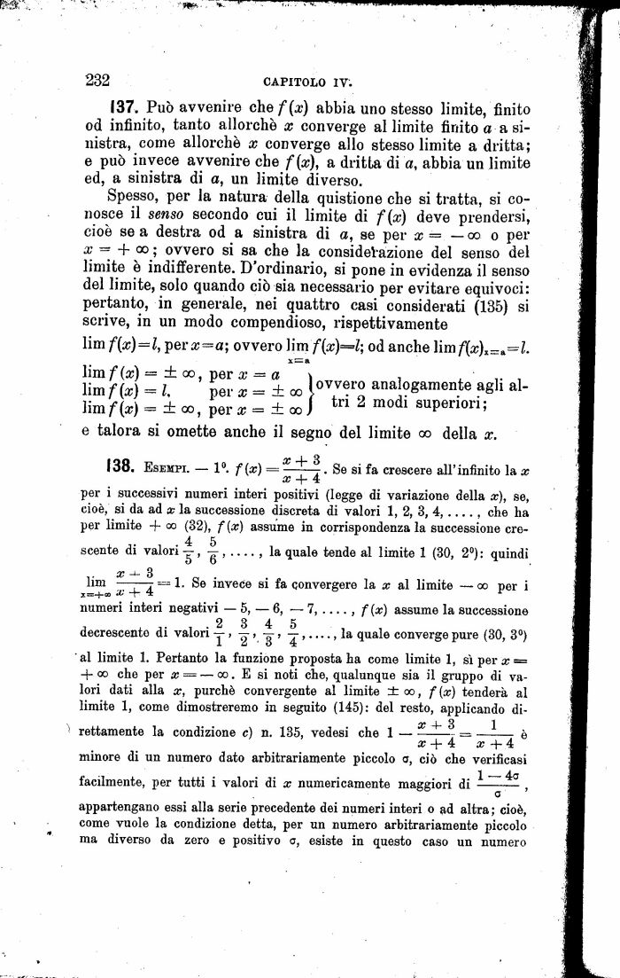 Spesso, per la natura della quistione che si tratta, si conosce il senso secondo cui il limite di f{x) deve prendersi, cioè se a destra od a sinistra di a, se per x o per x = + oo ; ovvero si sa che la considelazione del senso del limite è indifferente. D'ordinario, si pone in evidenza il senso del limite, solo quando ciò sia necessario per evitare equivoci: pertanto, in generale, nei quattro casi considerati (135) si scrive, in un modo compendioso, rispettivamente