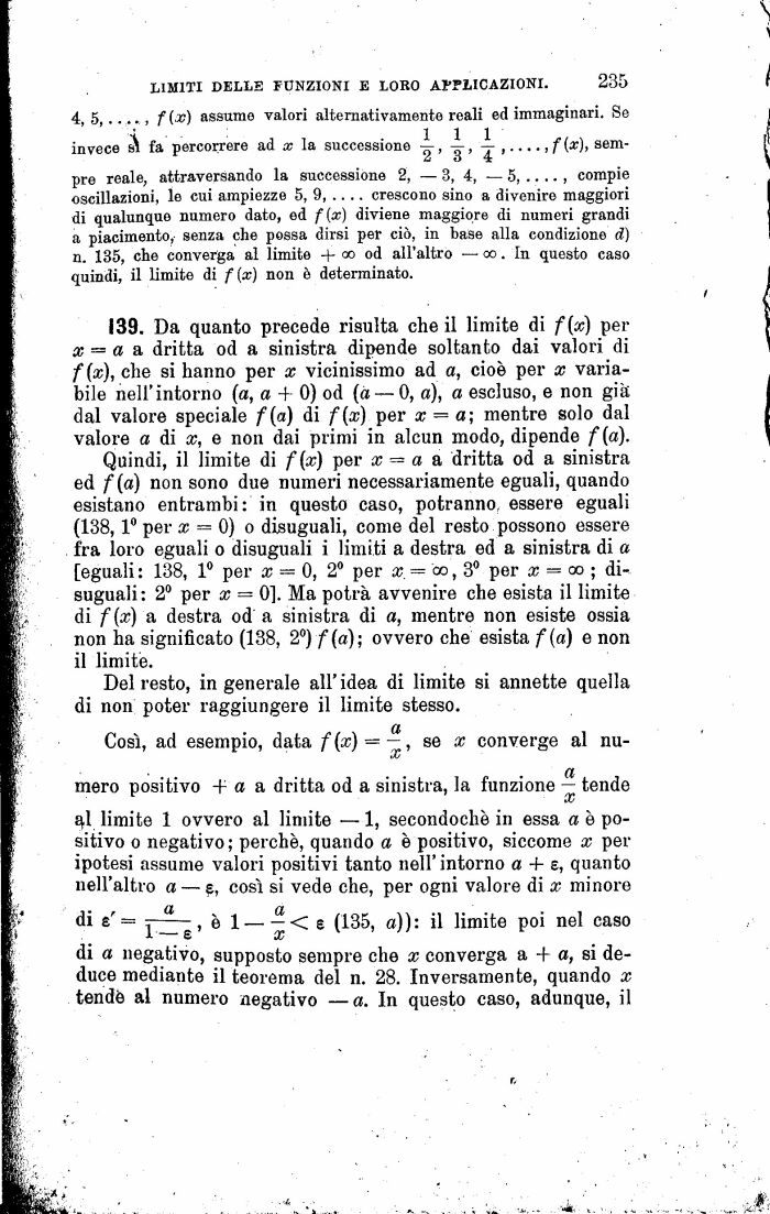 Quindi, il limite di f(x) per x = a a dritta od a sinistra ed f{a) non sono due numeri necessariamente eguali, quando esistano entrambi: in questo caso, potranno essere eguali (138,1° per x 0) o disuguali, come del resto possono essere fra loro eguali o disuguali i limiti a destra ed a sinistra di a [eguali: 138, 1° per x 0, 2° per x. oo, 3° per x = oo ; disuguali: 2° per x 0]. Ma potrà avvenire che esista il limite di f(x) a destra od a sinistra di a, mentre non esiste ossia non ha significato (188, 2°) f(a); ovvero che esista f(a) e non il limite.