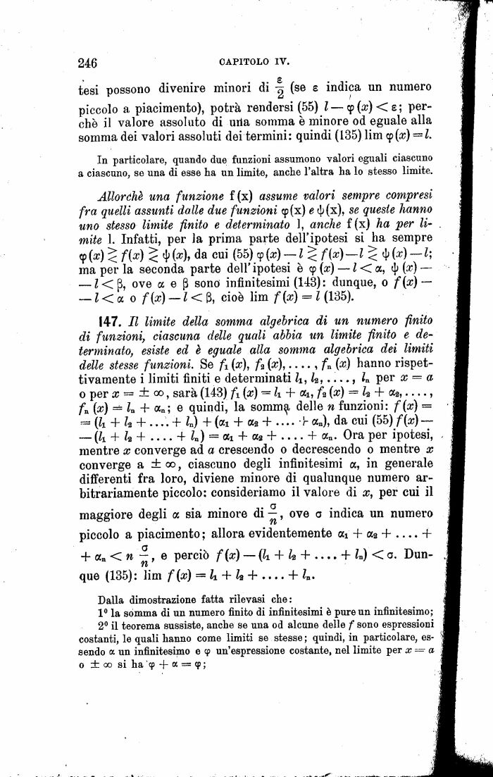 Io la somma di un numero finito di infinitesimi è pure un infinitesimo; 2° il teorema sussiste, anche se una od alcune delle f sono espressioni costanti, le quali hanno come limiti se stesse ; quindi, in particolare, essendo a un infinitesimo e cp un'espressione costante, nel limite per x a o ±oo si ha 9 + a = cp ;