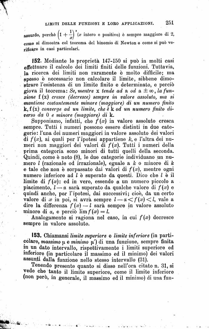 153. Chiamansi limite superiore e limite inferiore (in particolare, massimo ¡a e minimo fi,') di una funzione, sempre finita in un dato intervallo, rispettivamente i limiti superiore ed inferiore (in particolare il massimo ed il minimo) dei valori assunti dalla funzione nello stesso intervallo (31).