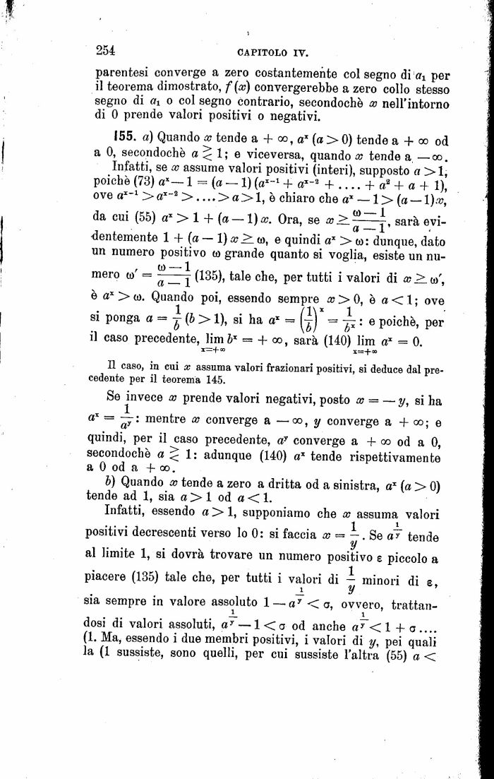 Se invece x prende valori negativi, posto x y, si ha a1 = : mentre x converge a oo, y converge a + oo; e quindi, per il caso precedente, ay converge a + oo od a 0, secondochè a < 1: adunque (140) a* tende rispettivamente a 0 od a + oo.