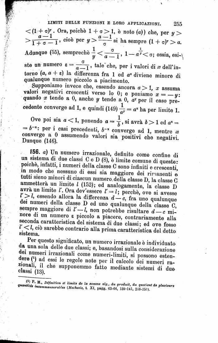 Per questo significato, un numero irrazionale è individuato da una sola delle due classi; e, basandosi sulla considerazione dei numeri irrazionali come numeri-limiti, si possono estendere i1) ad essi le regole note per il calcolo dei numeri razionali, il che supponemmo fatto mediante sistemi di due classi (18).