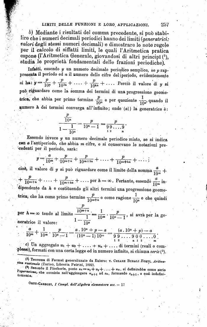 b) Mediante i risultati del comma precedente, si può stabilire che i numeri decimali periodici hanno dei limiti (generatrici: valori degli stessi numeri decimali) e dimostrare le note regole per il calcolo di siffatti limiti, le quali l'Aritmetica pratica espone (l'Aritmetica Generale, giovandosi di altri principi 0), studia le proprietà fondamentali delle frazioni periodiche).