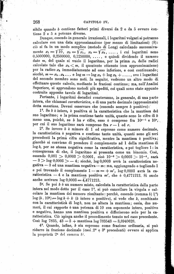 2°. Se invece b è minore di 1 ed espresso come numero decimale, la caratteristica è negativa e contiene tante unità, quanti sono gli zeri precedenti la prima cifra significativa, mentre la mantissa è positiva; giacché si conviene di prendere il complemento ad l della mantissa di log 6, per se stessa negativa come la caratteristica, e poi togliere 1 : in conseguenza di che, il logaritmo si presenta come un binomio. Così, essendo 0,001 > 0,0003 > 0,0001, cioè IO'3 > 0,0003 > IO'4, sarà 3 > log 0,0003 > 4; sicché, log 0,0003 avrà la caratteristica negativa 3 ed una mantissa negativa m: ma, aggiungendo e togliendo 1 e poi trovando il complemento 1 m + m', log 0,0003 avrà la caratteristica 4 e la mantissa positiva m', che è 0,4771213. Si suole anche scrivere log 0,0003 = 4^4771213.