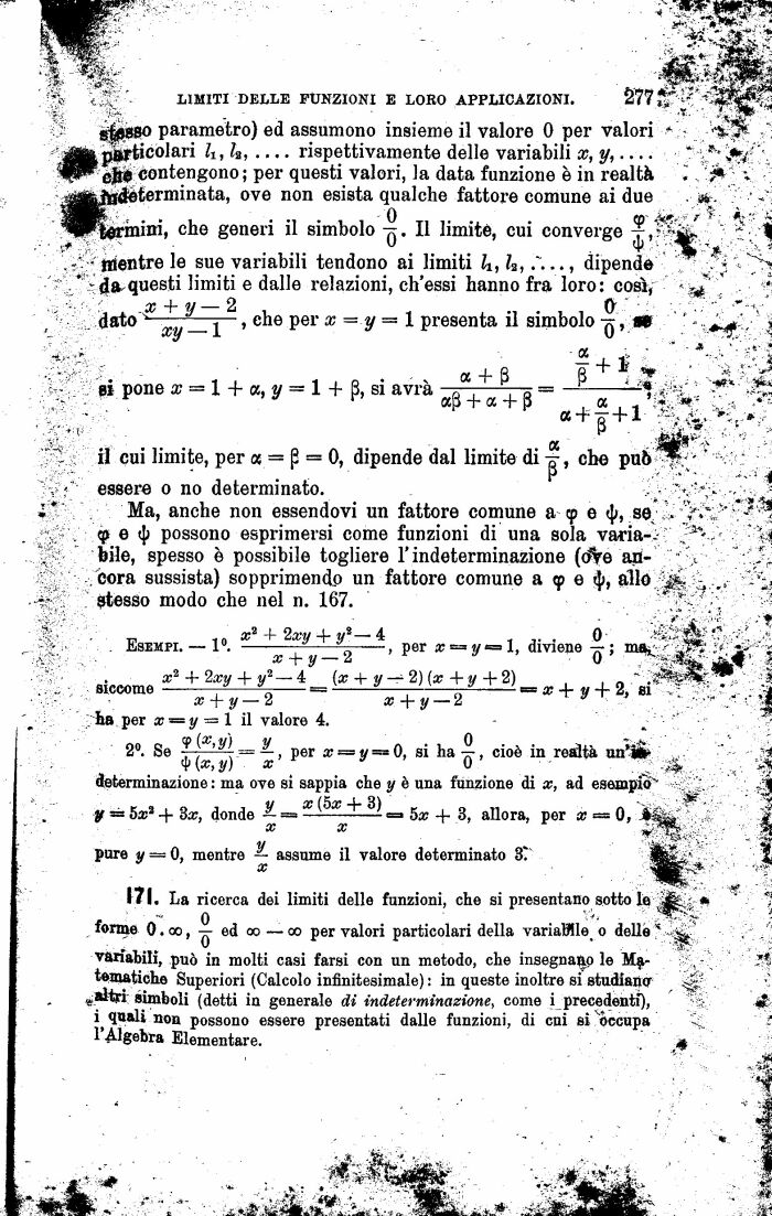 variabili, può in molti casi farsi con un metodo, che insegnano le Matematiche Superiori (Calcolo infinitesimale) : in queste inoltre si studiane ^ eal%i simboli (detti in generale di indeterminazione, come i precedenti), i qnali non possono essere presentati dallo funzioni, di cui si Occupa < l'Algebra Elementare. 4
