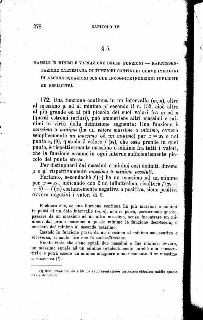 172. Una funzione continua in un intervallo (m, n), oltre al massimo p, ed al minimo ja' secondo il n. 153, cioè oltre al più grande ed al più piccolo dei suoi valori fra m ed n (questi estremi inclusi), può ammettere altri massimi e minimi in virtù della definizione seguente: Una funzione è massima o minima (ha un valore massimo o minimo, ovvero semplicemente un massimo od un minimo) per x %i o nel punto xi (9), quando il valore f (#i), che essa prende in quel punto, è rispettivamente massimo o minimo fra tutti i valori, che la funzione assume in ogni intorno sufficientemente piccolo del punto stesso.