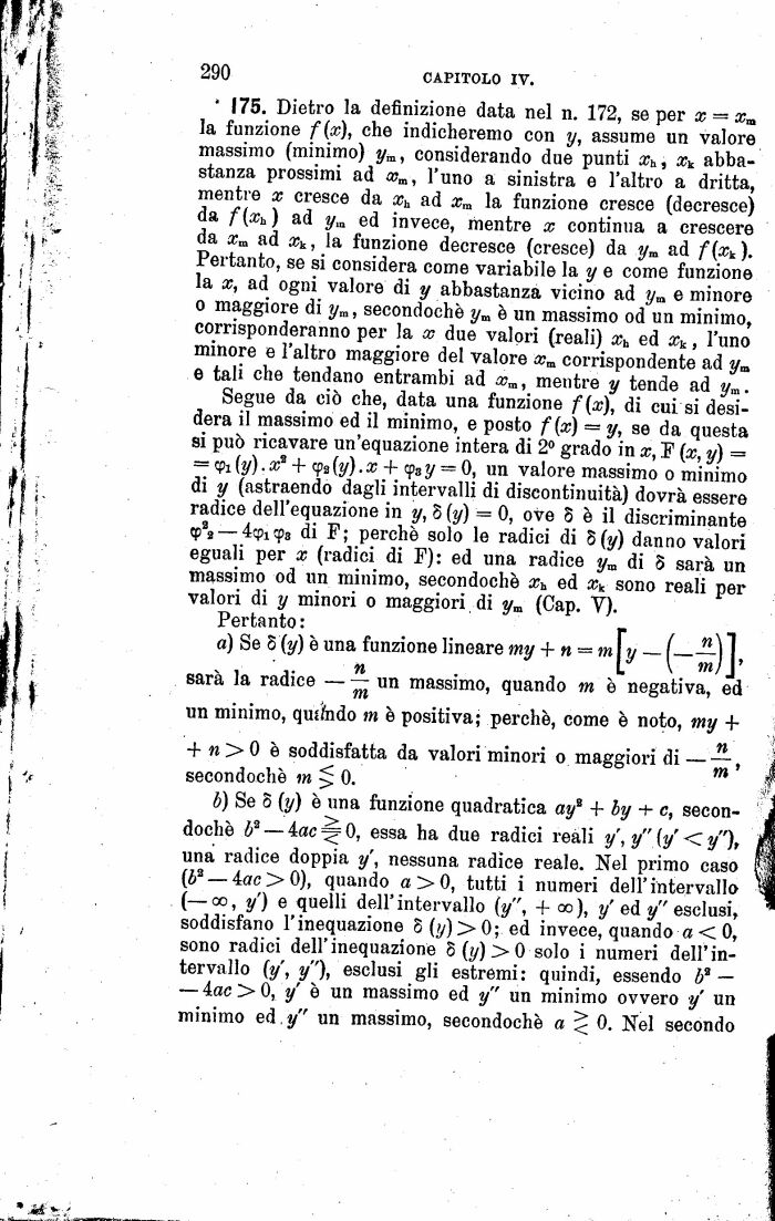 Segue da ciò che, data una funzione / %(#), di cui si desidera il massimo ed il minimo, e posto f[x) = y, se da questa si può ricavare un'equazione intera di 2° grado in x, E (x, y) = = cpi (y). x2 + cp3 [y) " oc + cp3 y = 0, un valore massimo o minimo di y (astraendo dagli intervalli di discontinuità) dovrà essere radice dell'equazione in y, 8 (y) = 0, ove 8 è il discriminante cpaa 4cpx di F; perchè solo le radici di d(y) danno valori eguali per x (radici di F): ed una radice ym di 5 sarà un massimo od un minimo, secondochè xh ed xk sono reali per valori di y minori o maggiori di ym (Cap. Y).