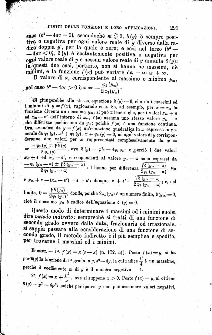 Questo modo di determinare i massimi ed i minimi suolsi dire metodo indiretto : semprechè si tratti di una funzione di secondo grado ovvero dalla data, frazionaria od irrazionale, si sappia passare alla considerazione di una funzione di secondo'grado, il metodo indiretto è il più semplice e spedito, per trovarne i massimi ed i minimi.