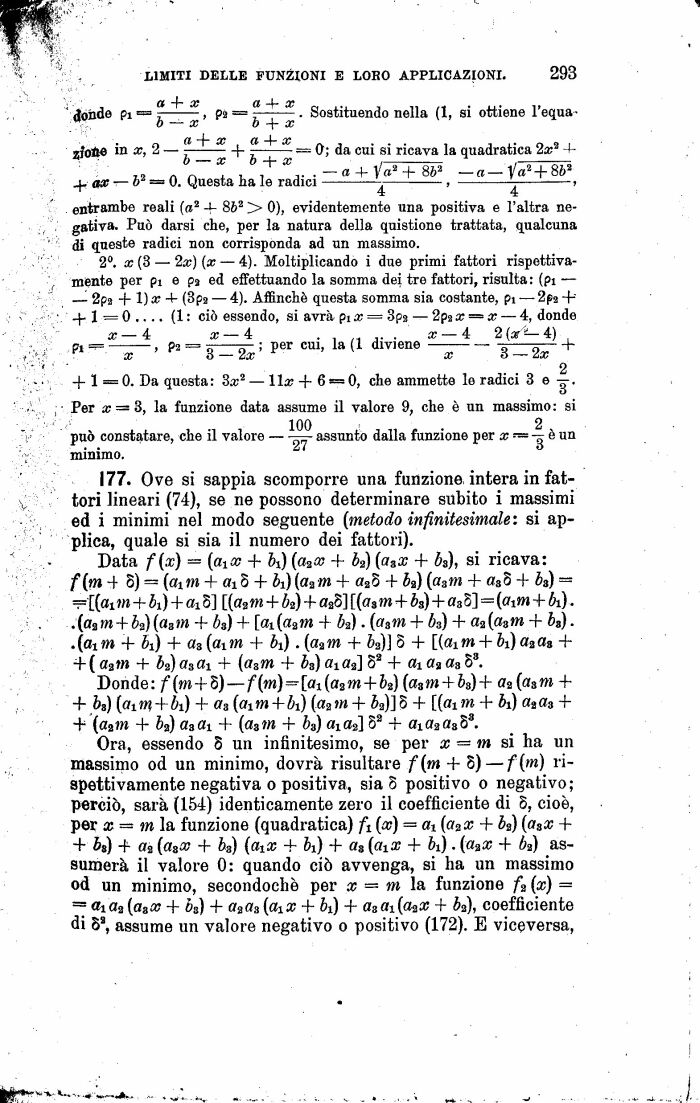 177. Ove si sappia scomporre una funzione, intera in fattori lineari (74), se ne possono determinare subito i massimi ed i minimi nel modo seguente (metodo infinitesimale: si applica, quale si sia il numero dei fattori).