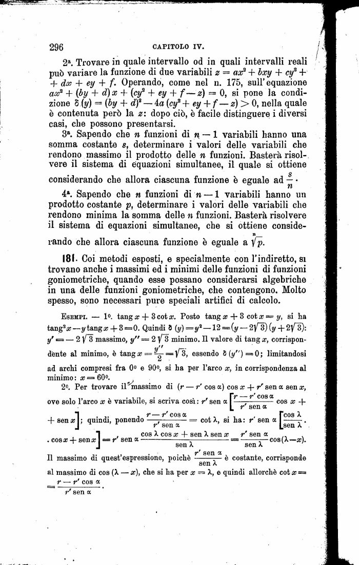 181- Coi metodi esposti, e specialmente con l'indiretto, si trovano anche i massimi ed i minimi delle funzioni di funzioni goniometriche, quando esse possano considerarsi algebriche in una delle funzioni goniometriche, che contengono. Molto spesso, sono necessari pure speciali artifici di calcolo.