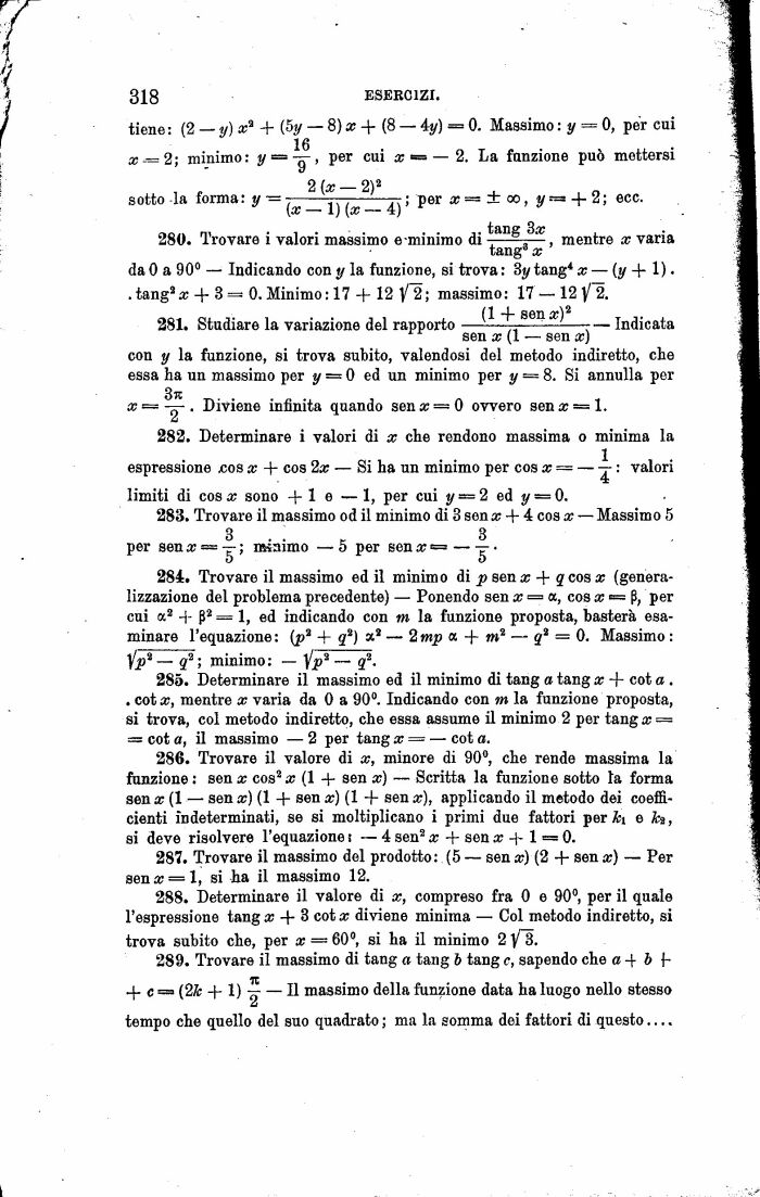 288. Determinare il valore di x, compreso fra 0 e 90°, per il quale l'espressione tang x + 3 cot x diviene minima Col metodo indiretto, si trova subito che, per x 60°, si ha il minimo 2 V~3.