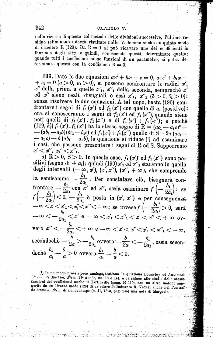 I1) In nn modo press'apoco analogo, trattano la quistione Bonnefoy ed Automari (Tonni, de Mathém. Éiem., 17e année, nn. 13 e 14); e la riduce alio studio delle stesse funzioni dei coefficienti anche il Tartinville (pagg. 97-110), con un altro metodo suggerito da un diverso modo (129) dì calcolare l'eliminanto B. Vedasi anclie nel Journal de Mathem. Élém. di Longchamps (n. 11, 1893, pag. 215) una nota di Margevie.