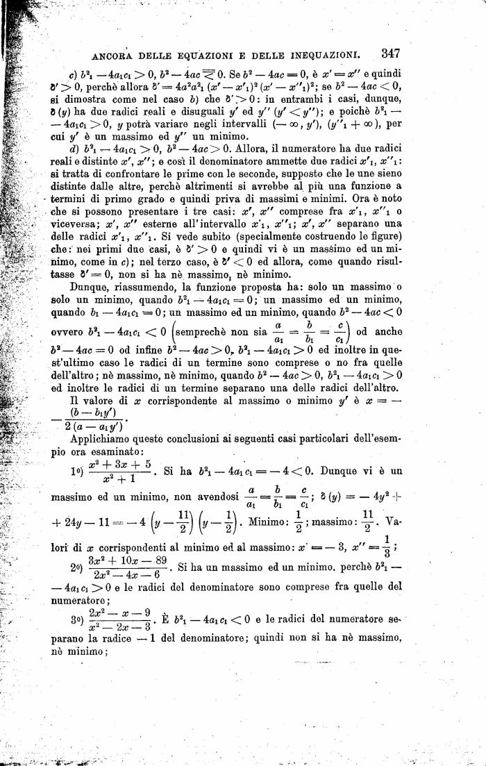 i* 4ac = 0 od infine b2 4ac > 0, b\ 4aici > 0 ed inoltre in quest'ultimo caso le radici di un termine sono comprese o no fra quelle dell'altro ; nè massimo, nè minimo, quando b2 4ac > 0, b\ 4aiCi > 0 ed inoltre le radici di un termine separano una delle radici dell'altro. Il valore di x corrispondente al massimo o minimo y' è x