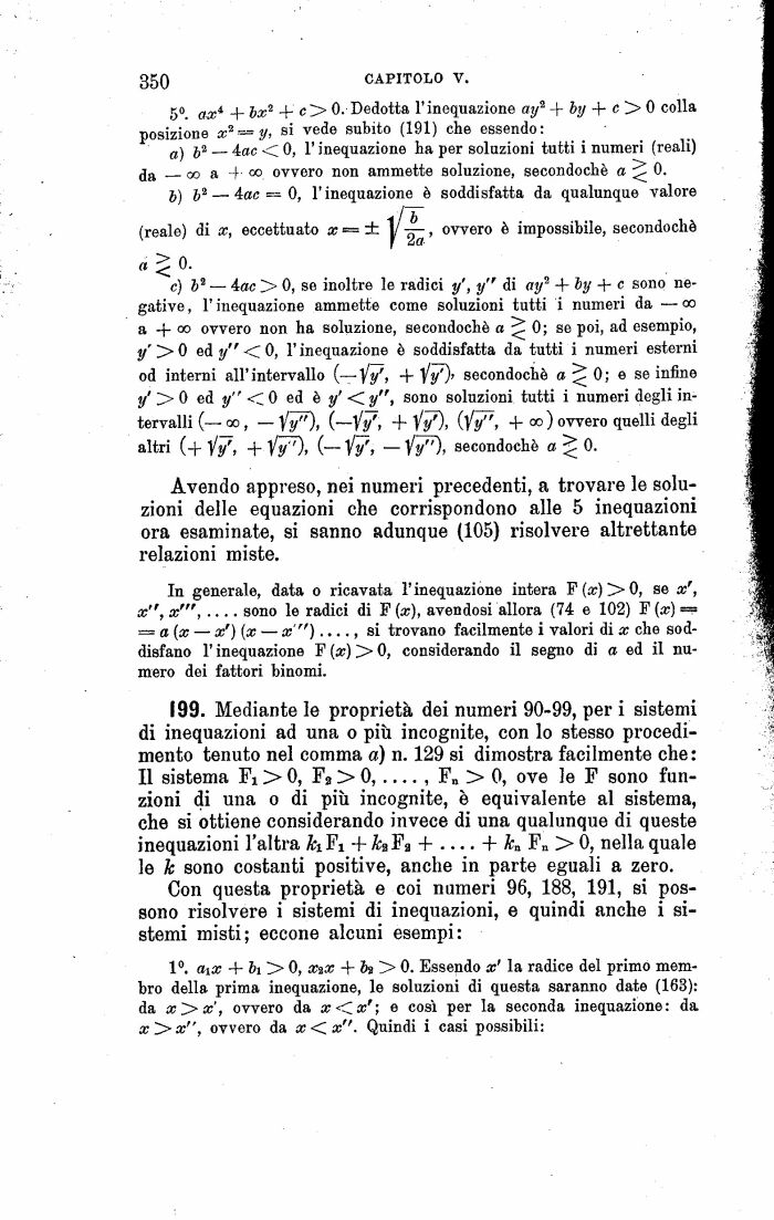 199. Mediante le proprietà dei numeri 90-99, per i sistemi di inequazioni ad una o più incognite, con lo stesso procedimento tenuto nel comma a) n. 129 si dimostra facilmente che: Il sistema Fi > 0, Fa > 0,----, F > 0, ove le F sono funzioni di una o di più incognite, è equivalente al sistema, che si ottiene considerando invece di una qualunque di queste