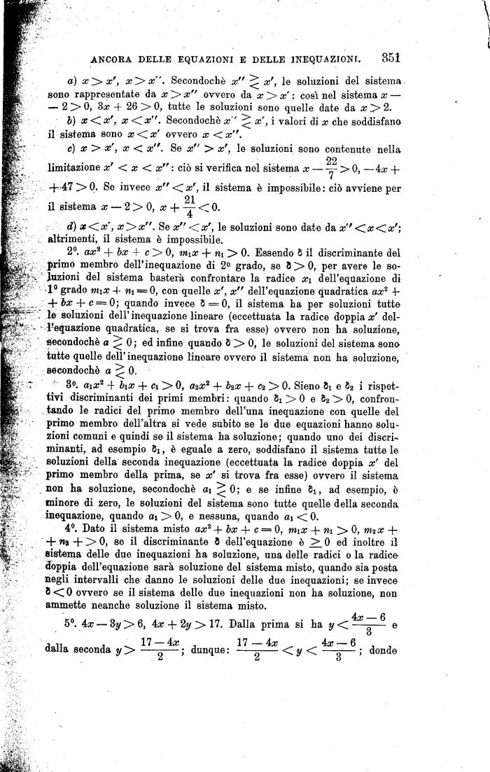 2°. ax2 + bx -, c > 0, i«^ -f «i > 0. Essendo 6 il discriminante del primo membro dell'inequazione di 2° grado, se 8>0, per avere le soluzioni del sistema basterà confrontare la radice xi dell'equazione di Io grado mix 4- m = 0, con quelle x', x' dell'equazione quadratica ax2 4- %\- bx + c = 0) quando invece 8=0, il sistema ha per soluzioni tutte le soluzioni dell' inequazione lineare (eccettuata la radice doppia x' dell'equazione quadratica, se si trova fra esse) ovvero non ha soluzione, secondochè « ^ 0 ; ed infine quando 8 > 0, le soluzioni del sistema sono tutte quelle dell' inequazione lineare ovvero il sistema non ha soluzione, secondochè a ^ 0.