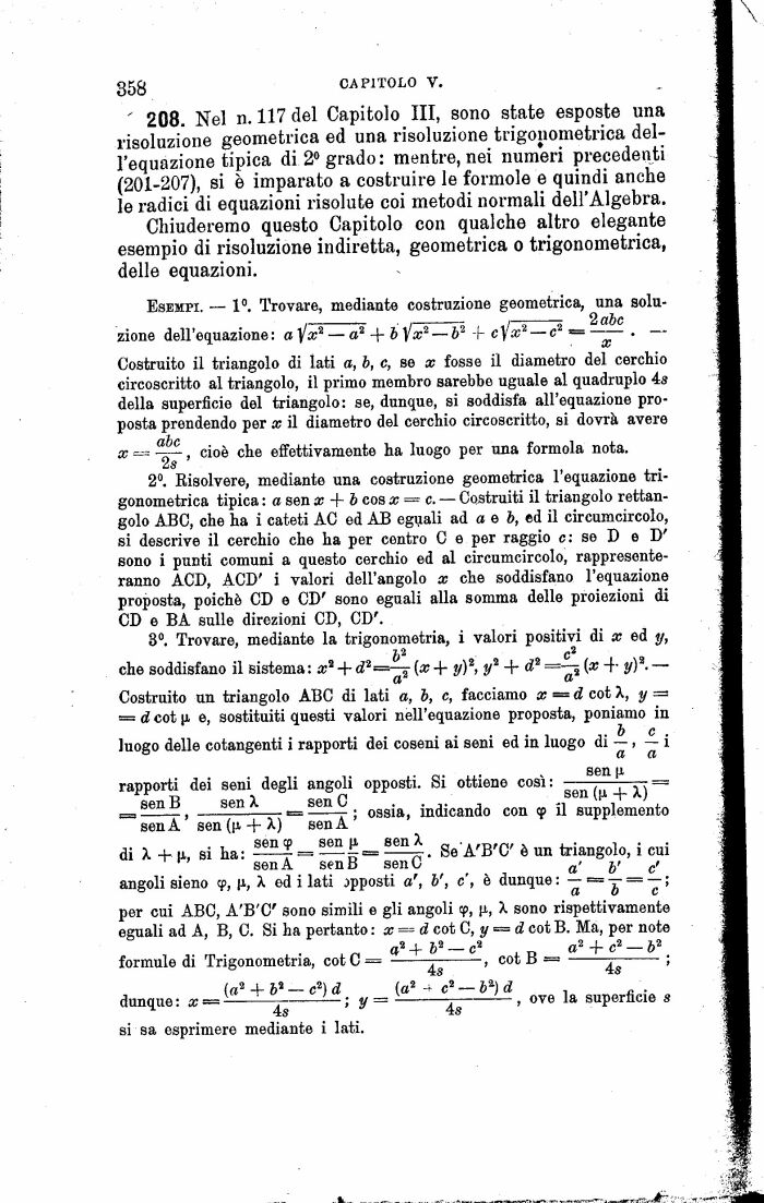 ' 208. Nel n. 117 del Capitolo III, sono state esposte una risoluzione geometrica ed una risoluzione trigonometrica dell'equazione tipica di 2° grado: mentre, nei numeri precedenti (201-207), si è imparato a costruire le forinole e quindi anche le radici di equazioni risolute coi metodi normali dell'Algebra.