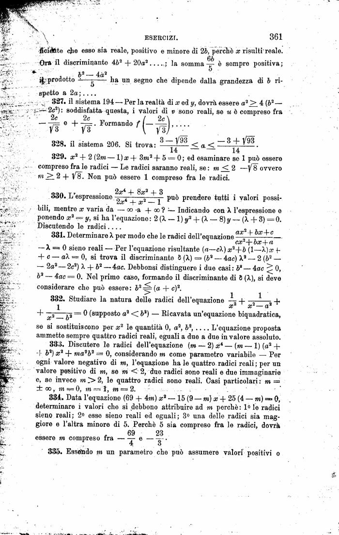329. x2 + 2 (2m 1 ) x + 3»i2 -f 5 = 0 ; ed esaminare se 1 può essere compreso fra le radici Le radici saranno reali, se : m <_ 2 V 8 ovvero >»>2 4- l/8'. Non può essere 1 compreso fra le radici.