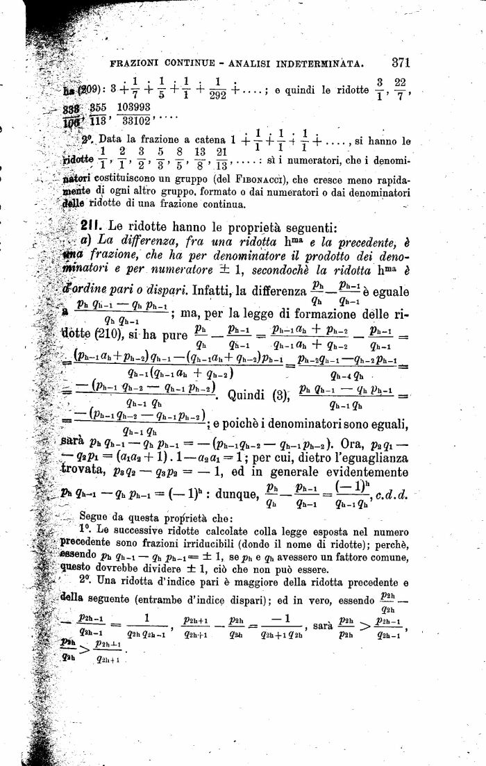 Segue da questa proprietà che: SSÌJ 1°. Le successive ridotte calcolate colla legge esposta nel numero precedente sono frazioni irriducibili (donde il nome di ridotte); perchè, essendo p^ gh_1 qh pb^t = ± 1, se ph e qi, avessero un fattore comune, " pesto dovrebbe dividere ± 1, ciò che non può essere. 'Mai' 2°. Una ridotta d'indice pari è maggiore della ridotta precedente e