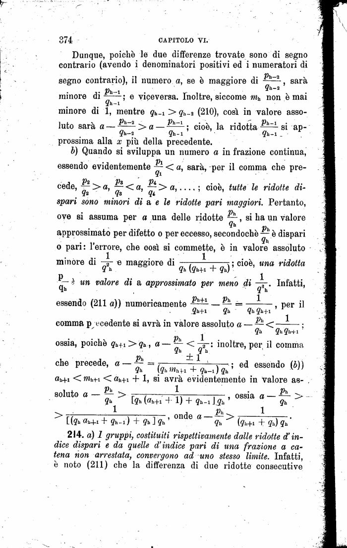 214. a) 1 gruppi, costituiti rispettivamente dalle ridotte d'indice dispari e da quelle d'indice pari di una frazione a catena non arrestata, convergono ad uno stesso limite. Infatti, è noto (211) che la differenza di due ridotte consecutive