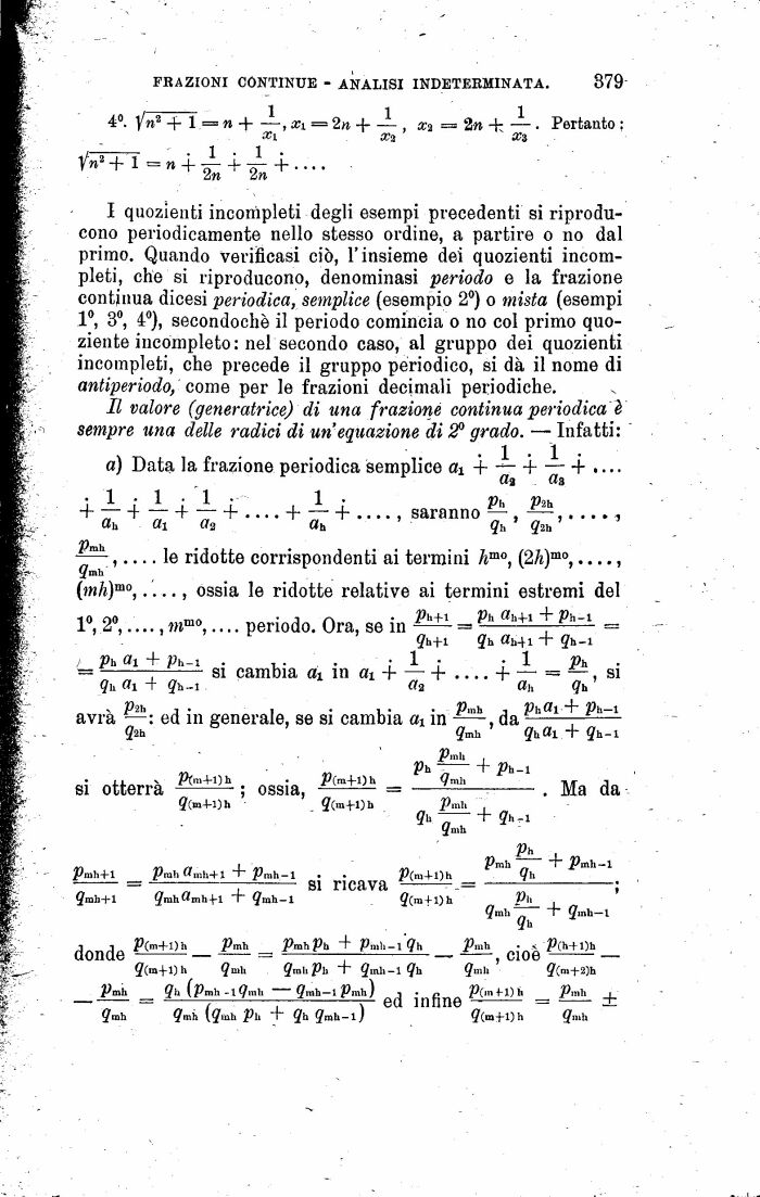 I quozienti incompleti degli esempi precedenti si riproducono periodicamente nello stesso ordine, a partire o no dal primo. Quando verificasi ciò, l'insieme dei quozienti incompleti, che si riproducono, denominasi periodo e la frazione continua dicesi periodica, semplice (esempio 2°) o mista (esempi 1°, 3°, 4°), secondochè il periodo comincia o no col primo quoziente incompleto: nel secondo caso, al gruppo dei quozienti incompleti, che precede il gruppo periodico, si dà il nome di antiperiodo, come per le frazioni decimali periodiche.