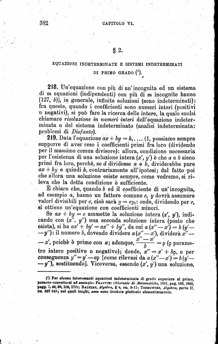 218. Un'equazione con più di un'incognita ed un sistema di m equazioni (indipendenti) con più di m incognite hanno [127, è)], in generale, infinite soluzioni (sono indeterminati): fra queste, quando i coefficienti sono numeri interi (positivi o negativi), si può fare la ricerca delle intere, la quale suolsi chiamare risoluzione in numeri interi dell'equazione indeterminata o del sistema indeterminato (analisi indeterminata: problemi di Diofanto).