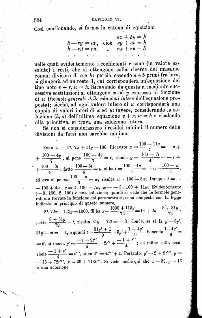 nelle quali evidentemente i coefficienti r sono (in valore assoluto) i resti, che si ottengono colla ricerca del massimo comun divisore di a e b: perciò, essendo a e b primi fra loro, si giungerà ad un resto 1, cui corrisponderà un'equazione del tipo noto v + r w = h. Ricavando da questa v, mediante successive sostituzioni si ottengono x ed y espresse in funzione di io (forinole generali delle soluzioni intere dell'equazione proposta); sicché, ad ogni valore intero di w corrisponderà una coppia di valori interi di x ed y: invece, considerando la soluzione (h, o) dell' ultima equazione v + r, w li e risalendo alla primitiva, si trova una soluzione intera.