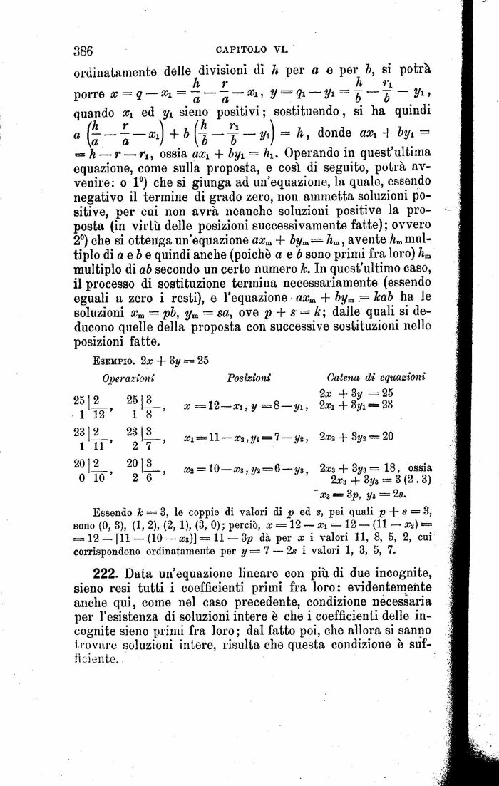 222. Data un'equazione lineare con più di due incognite, sieno resi tutti i coefficienti primi fra loro: evidentemente anche qui, come nel caso precedente, condizione necessaria per l'esistenza di soluzioni intere è che i coefficienti delle incognite sieno primi fra loro ; dal fatto poi, che allora si sanno trovare soluzioni intere, risulta che questa condizione è sufficiente. -